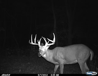 Monday, October 15, 2012. Sunset: 6:28 pm, closing: 6:58 pm, Temp: 53 degrees, Partly cloudy, Wind: S-SE 10-15 mph. I was having problems with my Direct TV, so I had to have a technician out. He didn't end up leaving until 5:25 pm. After a quick shower, I decided to give the ladder stand a try, since it was going to be such a short sit. Nothing to report. I did check the camera and got another picture of "Dr. Evil." This is a different angle than I have gotten in the past. (see attached) What a beast! Unfortunatley all of the photos I have of him are at night. Hopefully he will make a mistake in the coming weeks during daylight hours. Totals: Bob - 0 deer.